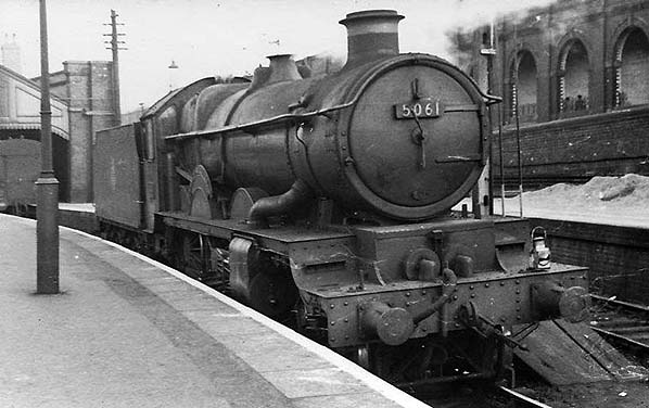 Copyright photo from the John Alsop collection ![]() Ex-GWR 4-6-0 ‘Castle’ class locomotive number 5061 'Earl of Birkenhead' is seen at the bay platform that was situated on the down side of the line at the north-western end of the station in the mid-1950s. The locomotive was based at Shrewsbury depot at this time. ![]()
