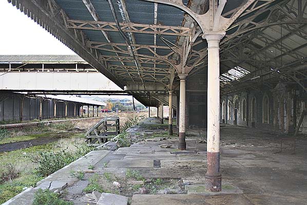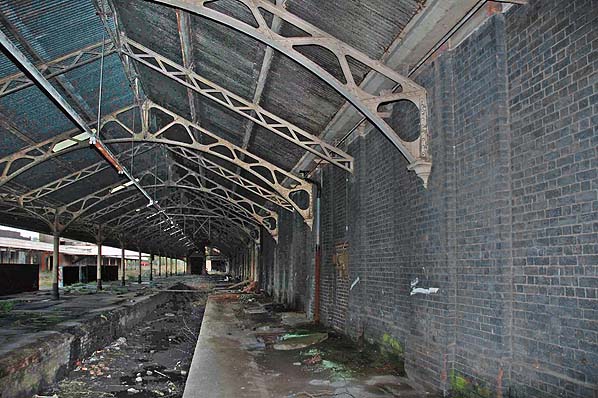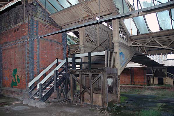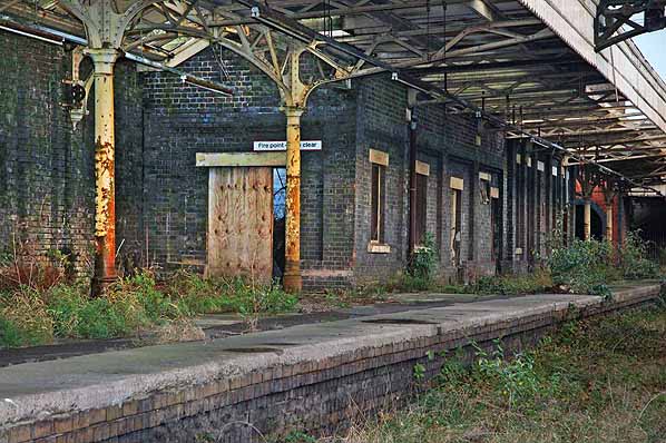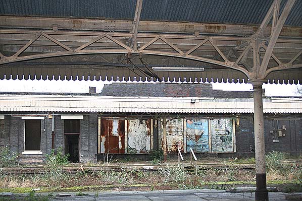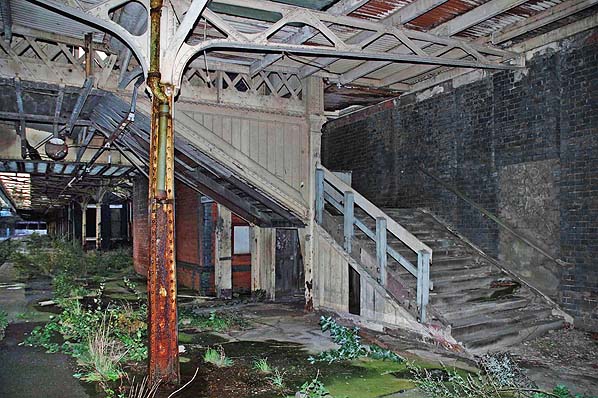 Photo by Steven Jukes ![]() Wolverhampton Low Level looking north-west in 2004. Photo by Steven Jukes ![]() The bridge at the south end of Wolverhampton Low Level was demolished and replaced by a section of road. Railway track was embedded into the pavement in recognition of the areas railway heritage. The new road and track feature is seen in this view looking north-west. The station can be seen beyond the fence. Photo by Steven Jukes ![]() Looking south-east along the down platform at Wolverhampton Low Level station in October 2005. Photo by Alex Cheasley ![]() A view looking north-west along the down platform of Wolverhampton Low Level in October 2005. Photo by Alex Cheasley ![]() The imposing main entrance to Wolverhampton Low Level station as it was in October 2005. Photo by Alex Cheasley ![]() Looking east from the down platform to the up. Posters dating from before the withdrawal of passenger services still adorned the walls when the photo was taken in October 2005. Photo by Alex Cheasley ![]() The up platform at Wolverhampton Low Level station seen in October 2005. Photo by Stuart Lambeth from his Flickr photostream ![]() A view of the footbridge steps on the up platform of Wolverhampton Low Level station seen in October 2005. Photo by Stuart Lambeth from his Flickr photostream ![]() The footbridge steps on the down platform as they were in October 2005. The low section of the steps had been altered after 1969. Photo by Stuart Lambeth from his Flickr photostream ![]() The entrance hall of Wolverhampton Low Level seen in 2005 before restoration had got underway. Photo by Stuart Lambeth from his Flickr photostream ![]() The up platform bay which was located at the south end of Wolverhampton Low Level station seen in October 2005. Photo by Stuart Lambeth from his Flickr photostream Click here to see more photos from 2001 to 2010 ![]()