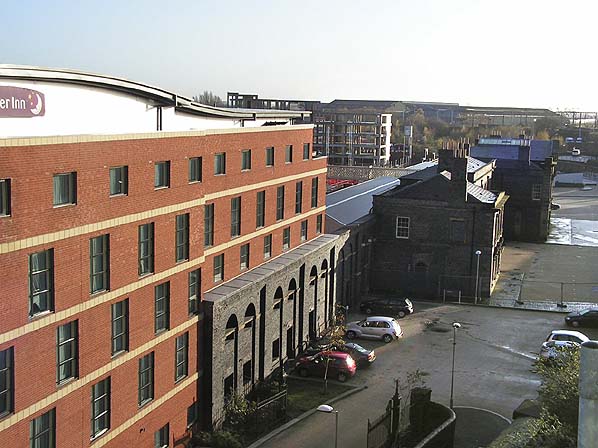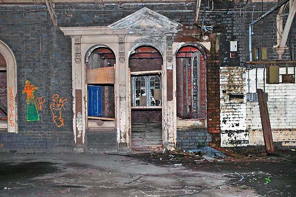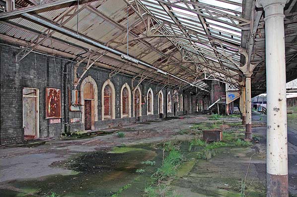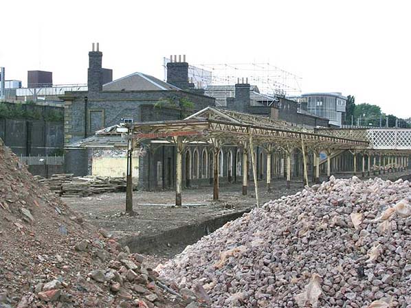 The original station building at Wolvehampton Low Level as seen from the footbridge of the High Level station in December 2009. At this time much of the site had been developed but work was underway on the restoration of the stations canopy at its southern end.