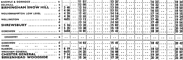 The BR[WR] timetable for 1949 showed thirty-five departures Monday-to-Thursday in the up direction towards Birmingham as shown in the table below. In the down direction towards Shrewsbury there were twenty-six departures Monday-to-Friday. Extra trains ran in the up direction on Fridays and Saturdays and in the down direction on Saturdays.