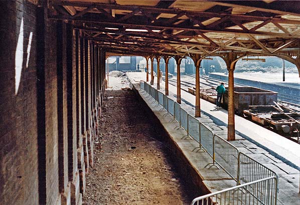 The up platform south end bay looking south-east on 8 April 1987.