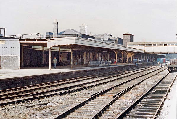 A view looking south-east along the down platform at Wolverhampton Low Level station taken during the open day that was held on 18 April 1987.
