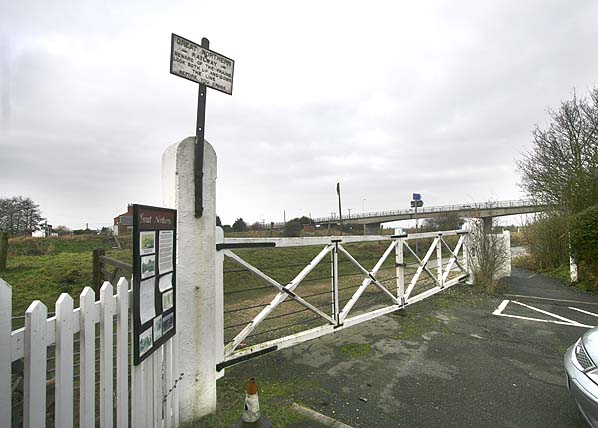 Woodhall Junction level crossing gates in January 2010, these are replacement gates. Note the board on the left with history of the station and photographs.