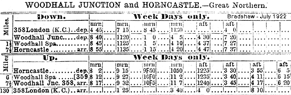 Sources: The Horncastle & Woodhall Junction Railway by AJ Ludlam. Published 1986 by Oakwood Press ISBN 0 85361 326 5. Woodhall Spa Community web site & Woodhall Spa Cottage Museum web site.