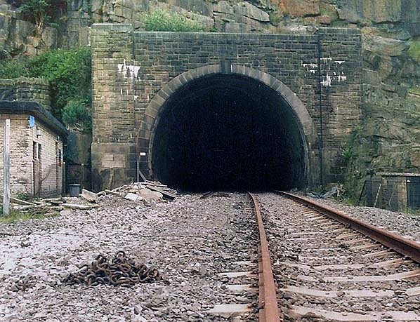 The west portal of Woodhead tunnel during track lifting in 1985.