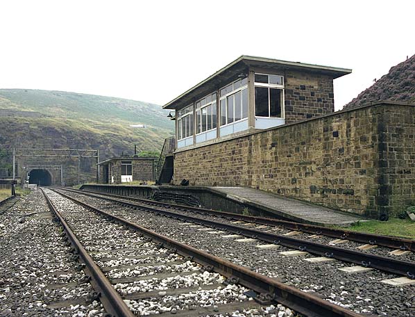 The staggered platforms of Woodhead Station in August 1983
