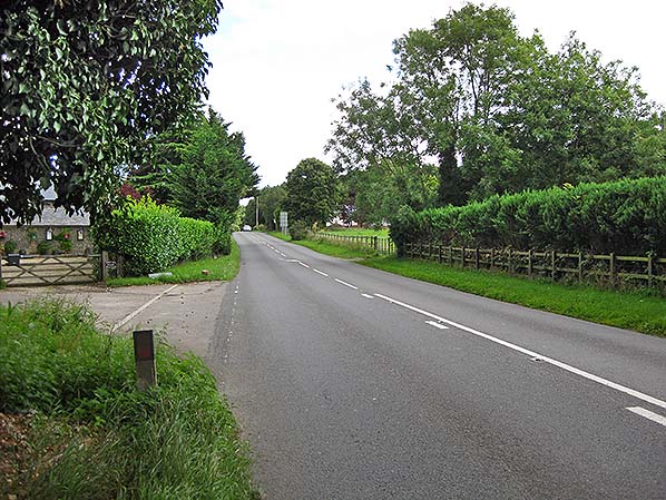 Looking along the A1075 at the site of the level crossing at Wretham and Hockham in July 2017.