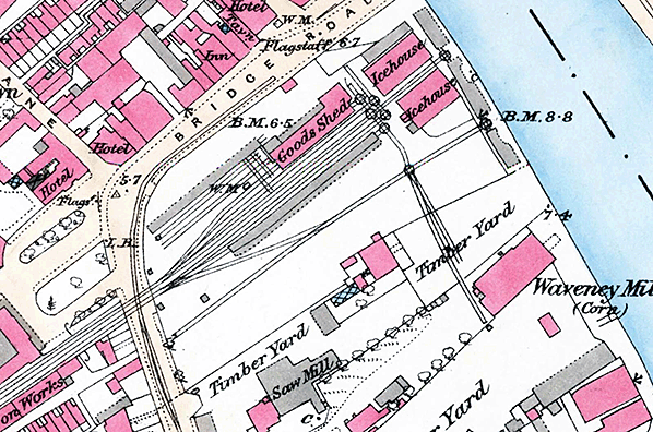 From Illustrated London News ![]() ![]() 1887 1:2,500 OS Map. The platforms can be seen at the length they had been extended to (300ft to 450ft) in 1884 but there is still no Platforms 1 and 4 apart from a siding stub encroaching into what would become Platform 4 (the northernmost platform face). Of particular interest is the short siding near the Malthouse, entered via turntables with the track crossing the running line at a right angle. One of the turntables is situated on, of all things, the Up (departures) running line. Whilst this arrangement may surprise some readers, it was not uncommon in the nineteenth century although as locomotives grew larger and heavier the practice was soon abandoned. Therein lies the problem with reliance upon old maps; the turntables are not shown on the 1886 map yet are thought to have been present since at least 1869. Mentioned in the text is a Great Eastern Railway Minute from 23 September 1869 which mentions a turntable causing frequent coupling breakages. The turntable required relocating but the cost of £50 was refused at the time. The next reference, this time specifically for a locomotive turntable, was in February 1881 and the £400 cost of this was recommended. This was a 40ft turntable and there is no record of when it was actually installed. What we do know is that also in February 1881 £208 was approved for a new turntable balance, so it would appear provision of a new balance was abandoned very rapidly in favour of a completely new turntable. We are grateful for the survival of old maps, Company Minutes and other sundry documents but after the passing of well over a century these are all we have to go on. Therefore it is possible the two turntables shown on this map constituted the original locomotive turning facilities but the passage of time means confirmation has become impossible. A further point on interest is the crane: nothing unusual about that, except that it seems to have disappeared and reappeared at various times. Note the cattle market and, north of the station, the bowling green. Studying various maps and photographs shows that the cattle market moved further south-west and the bowling green also became a cattle market. The latter is curious as photographic evidence does not concur with cartographic evidence; the 1928 map, for example, shows the bowling green site as being a cattle market yet aerial photographs from roughly the same time show that it as still a bowling green.