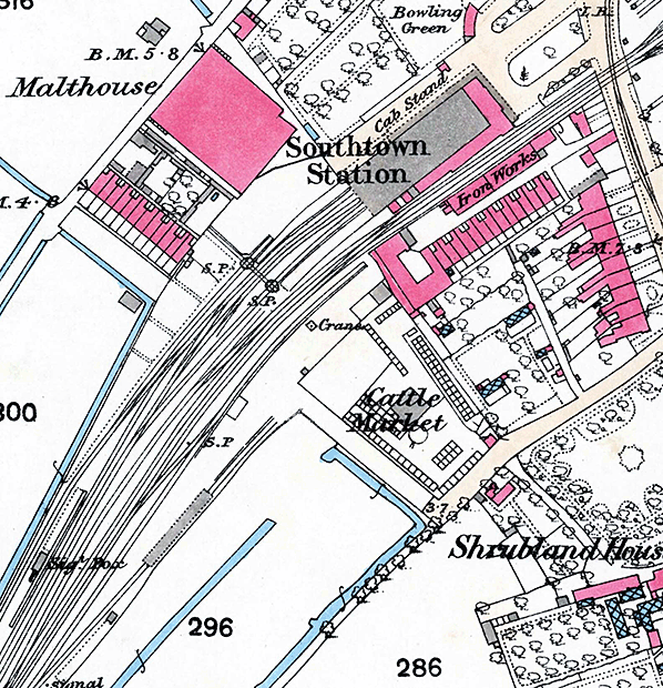 ![]() 1906 1:2,500 OS map. By this date South Town station plus its goods and locomotive facilities have taken on the form which would remain familiar until 1952 - with a few minor exceptions. The station now has three platform roads, with Platform 1 (on the south-east side of the station) coming into use with the opening of the Lowestoft line shortly before. What became Platform 4 has been widened at its outer end and is in use as a short bay probably, at this date, for non-passenger use. The coal yard, which was not provided until as late as 1884, is shown but as yet no cattle dock or pens are shown, The provision of cattle pens, photographic evidence suggests, was something of a 'now you see it, now you don't' affair and in later years the coal yard took over more or less the entire sidings area. The cattle market south of the station would later occupy the near-vacant site at the end of Station Road (the unnamed road running parallel to the coal yard). The siding running behind the signal box had been a dead end; it now continues southwards towards Yarmouth South Town Junction (off the bottom of the map). The iron works which had stood between the station and what was then Plevna Road has now gone.
