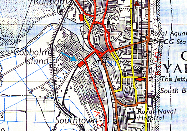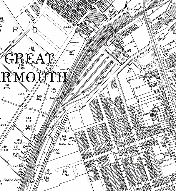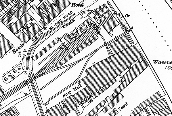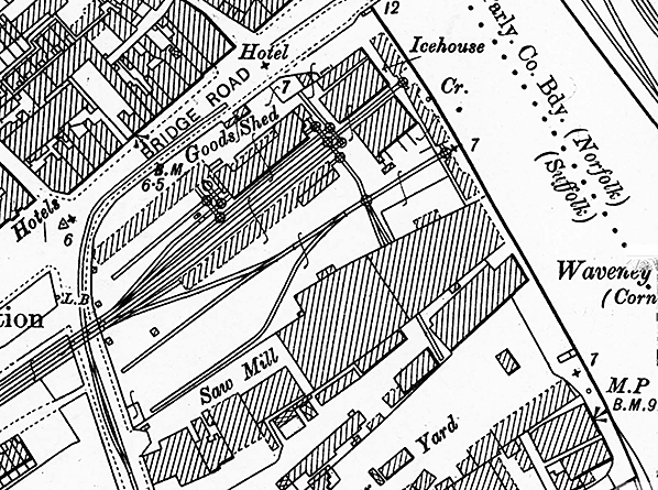 ![]() 1887 1:2,500 OS Map shows two tracks leading along the south side of South Town station and crossing the road into the goods yard. Maps of this age are not necessarily accurate; in the goods yard not all wagon turntables are shown yet the tracks to which they gave access are. In addition, two icehouses are shown yet surviving railway company records mention only one - that closest to Bridge Road and this building still stands today. The two hotels shown near the top left were, left to right, the Two Bears and the Railway Hotel. The latter still stands as of 2017 and is now a pizza outlet. Note the weighing machine (W.M.) on Bridge Road. Presumably this was for vehicles, horse drawn of course, wishing to cross Haven (aka Southtown) Bridge as the road was a Turnpike at this time - a situation, mentioned in the text, which caused some consternation for the GER.