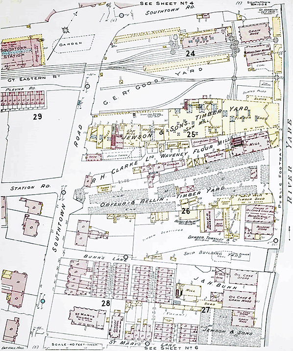 Click here for a larger version ![]() 1906 1:2,500 OS map. This map shows the goods yard more or less in the form it was maintain for the rest if its life, especially insofar as the track layout is concerned. This map makes a good comparison with the fire insurance plans from around the same time and reproduced below. It should be remembered that the two tracks crossing Southtown Road were not Up and Down lines but two bidirectional sidings. Note that, compared to the 1887 map, only one icehouse is indicated yet both buildings are still present. Railway records mention only one icehouse so it is possible that there is an error on the 1887 map. The building not marked as an icehouse may have been a fish-packing shed and such a building is mentioned in Company records, albeit without giving its precise location. Note the Norfolk/Suffolk boundary midway of the river; South Town station was therefore in Suffolk at this time. The weighing machine on Bridge Road has disappeared, or at least is no longer marked.