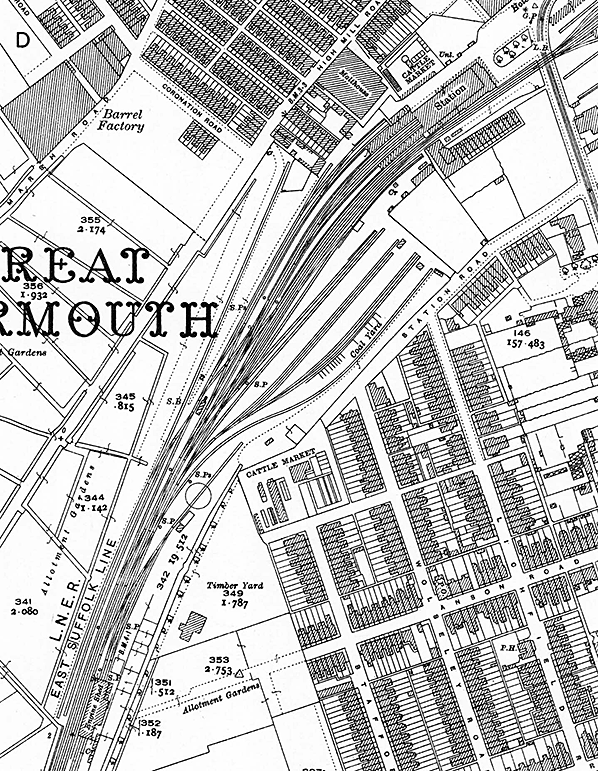 have, however, survived. Click here for a larger version. Plan reproduced by kind permission of The British Library. ![]() 1928 1:2,500 OS map. Apart from some alterations to sidings and pointwork, little has changed on the railway scene since 1906. An additional siding has, however, appeared on the Down side and stretches to a point opposite the end of Coronation Road but its purpose is unknown. It may have been for the barrel factory although given the factory's distance from the railway the siding would have offered little advantage unless the barrel business was booming to the extent where special facilities were deemed necessary. Great Yarmouth once had a thriving brewing industry, little known outside the locality owing, no doubt, to being overshadowed by the fishing industry. One point to note Is that the cattle market south of the station has now moved to the end of Station Road, opposite the locomotive turntable which by this time was a 60ft example and would remain so until 1951/52 when the little-known 65ft example took its place. Click here for a larger version.