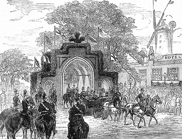 ![]() The arrival of the Prince of Wales, later to become King Edward VII, at Yarmouth South Town in June 1872. The Prince is known to have been in Yarmouth on 6 June that year, attending a number of functions, so this engraving probably represents the scene on 5 June. The primary purpose of the visit appears to have been concerned with the Norfolk Artillery, who had a detachment in Yarmouth. The Norfolk Artillery was a volunteer regiment and eventually became part of the TA before being disbanded in 1955. The Prince stayed at Shadingfield Lodge a number of times during the late nineteenth century and did so in 1872. Shadingfield Lodge was built in 1865 as a summer villa and eventually became a public house. Located on Marine Parade, South Beach, it became a casino in 2000. The so-called Triumphal Arch was probably a wooden structure draped, as seen here, in various garnishings assuming, that is, it actually existed as these engravings were prone to varying degrees of artistic licence. On the right a representation of the Two Bears hotel can be seen. One of the two bear statues can be seen and this proves something of a problem as local media, reporting on the demolition of the building during 2013/14 period, stated the bears, perched up on the roof, dated from 1910. As the artist could not have foreseen the appearance and position of the bears, unless time machines existed in 1872, they are therefore assumed to be much older. The building itself dated from 1865; rather this is the earliest record of it which has been discovered. Behind the hotel stands High Mill, said to have been the tallest brick-built mill in the country. When it was demolished its bricks were reused for the construction of some nearby terraced houses (see text).