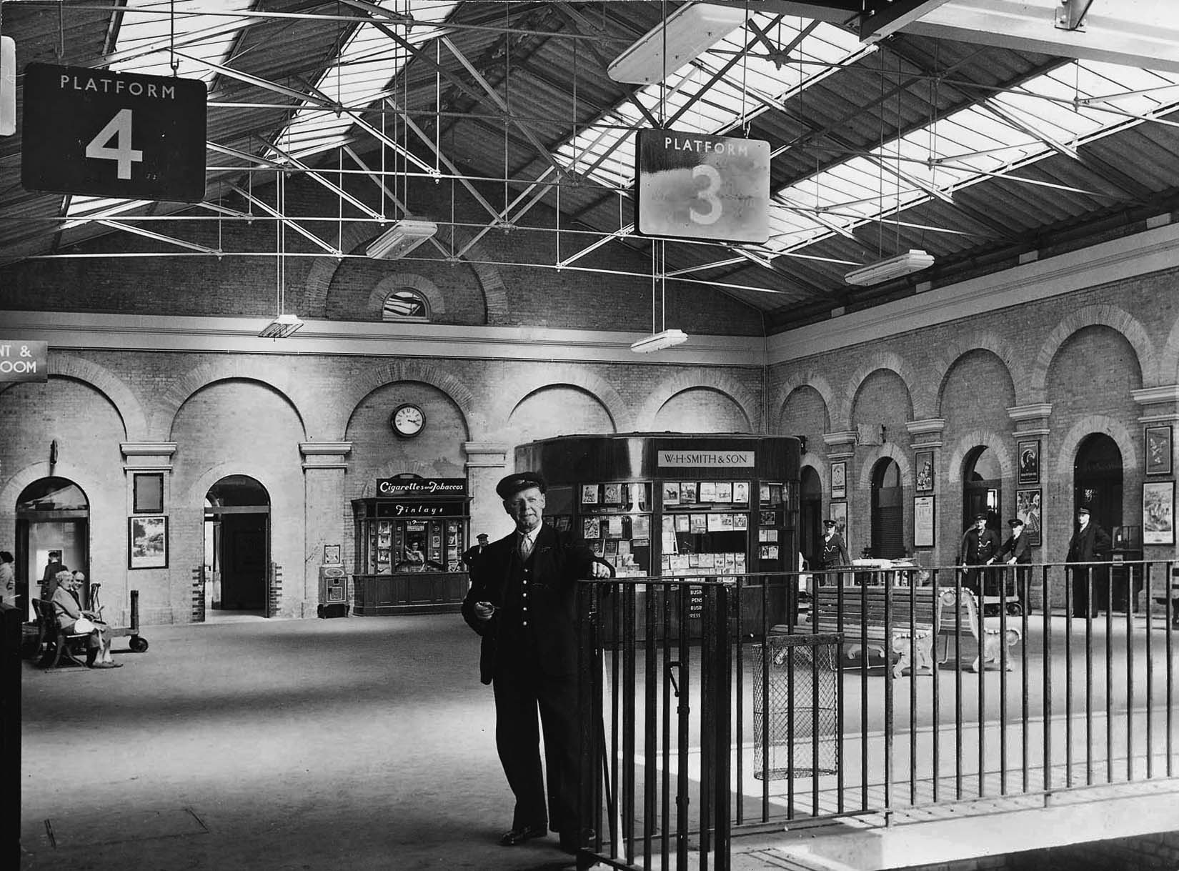 ![]() One of very few known photographs showing with any clarity South Town station concourse virtually in its entirety and when still in use. An Eastern Daily Press photograph dating from Wednesday 14 July 1954, stationmaster M. E. Lawn is seen beside the barrier leading to platforms 3 and 4. Six other staff members are visible, of which five are also posing for the camera. The open door, left of centre, led through the booking hall and out onto the station forecourt. Mr. Lawn and his family's accommodation was on the first floor above the booking hall, the pitched facade, present on both faces of the building, was deceiving and much of the roof was actually flat - see photographs of the exterior. The open door at far left led into the stationmaster's clerk's office and then the stationmaster's office. The 1952 BR alterations to Yarmouth South Town are well known, although it is not immediately obvious from this view that the changes had already taken place. The original trainshed roof, removed in 1952, extended back to cover the concourse and was to a clerestory design but the rather factory-like roof seen here predated this alteration and is thought to have been erected following damage during WWII. The suspended fluorescent lighting had been installed in 1952 and replaced gas lighting. At extreme bottom right was the end of the tracks serving platforms 2 and 3. The short undercroft, discernible here by the brickwork, was formed by the addition of a concrete raft installed by or during 1952 but why this was done is unclear. Readers above a certain age will remember the wire litter bins of the type seen here fixed to the railings. Usually seemingly always full, they emitted a most unpleasant odour and during summer were a magnet for wasps. Hardly a scrap of litter is to be seen on this occasion and no doubt some tidying up was undertaken prior to the camera arriving. The sign partially visible at far left states 'Refreshment & Waiting Room'. This facility was a new addition to the building in 1952 and is the rather incongruous flat-roofed appendage visible in later photographs of the exterior of the station building. Its construction necessitated the shortening of the track into Platform 4 by a few yards. The open doorway leading through the booking hall was one of two public entrances/exits, the other being out of view behind the W. H. Smith bookstall. The doorway visible here was originally the exit from the arrivals platform, later Platform 3, while the other was for departing passengers. This tidy arrangement also suited the clockwise flow of road vehicles around the forecourt. To the right of the open doorway stands a British Automatic Co. Ltd. (BAC) label stamping machine. Just visible on its slanting face is the pointer and dial; the dial was marked with letters, numerals and other figures such as '&'. Users inserted a coin, which for many years was 1d, selected each required character and pulled a lever for each one up to a maximum of ten. This stamped the selected characters on an aluminium strip and once complete another lever was pulled to cut off the strip which then dropped into a tray in the front of the machine. These stamped labels would be tied to luggage, kitbags, bunches of keys, bicycles or indeed onto anything which one felt a label was a good idea. Whilst the idea was ostensibly a good one, in practice these purely mechanical machines were slow to use and often surrounded by groups of children who thought them jolly good fun. Nevertheless BAC label stamping machines were a common site at railway and some tube stations among other public locations for a great many years. BAC also produced weighing machines, vending machines for sweets, chocolate, Aspirins, cigarettes etc. as well as platform ticket issuing machines. To the right of the BAC machine and beneath the clock is Finlay's tobacco kiosk. Finlay & Co. Ltd. dated back to 1847 and, like the BAC machines, were a familiar site at railway and tube stations and other public locations. Perhaps less well known is that they also ran conventional newsagent shops on the proverbial High Street. The original Finlay company went into receivership in 1989 and was eventually sold. To an extent competing with W. H. Smith, Finlay's station kiosks, which were not all as small as that at South Town, tended to focus more upon the sale of cigarettes, tobacco and fancy goods with Smiths being more a conventional newsagent but there nevertheless was always a degree of conflict. The kiosk is seen here in the position earmarked for it on British Railways station plans of 1952 but where it had stood previously is unclear. The arched window behind the kiosk had been the rear window, with fluted glass, of the original ticket office which was relocated in 1952 to the southermost end of the booking hall, ie to the right in the above view. Thereafter a Benn & Cronin train indicator board stood in the booking hall directly behind the Finlay's kiosk but whether this was the same indicator which had stood outside overlooking South Town Road is not known. In all probability, however, it was. W. H. Smith needs no introduction and of course is still very much with us today. The camera is looking here at the rear of the bookstall, the counter sensibly facing the booking hall to attract passengers as they walk towards the platforms. Between the bookstall and railings stands the well known pair of benches decorated on each end with representations of fish and shells, see photograph elsewhere in these pages. Among the more substantial alterations of 1952 were the various rooms on the right. These rooms have been described elsewhere but to recap they were the original waiting rooms, toilets and staff facilities. The arch second from left (right of the bookstall) had once been a doorway but in 1952 was partially bricked-up from the ground upwards and a counter and roller shutter installed. The annotation on BR's 1952 plan states "Form new luggage coun