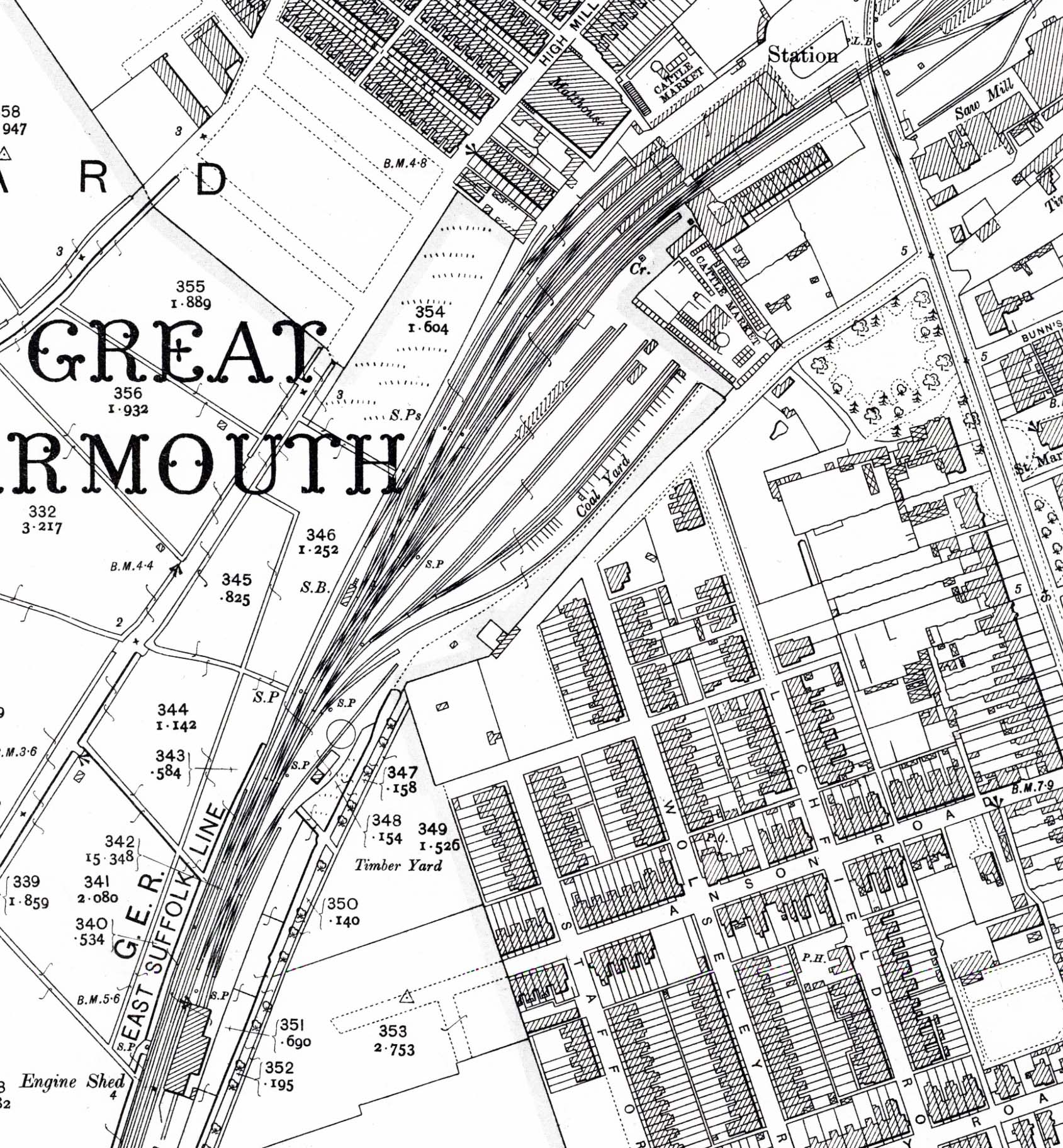 ![]() 1906 1:2,500 OS map. By this date South Town station plus its goods and locomotive facilities have taken on the form which would remain familiar until 1952 - with a few minor exceptions. The station now has three platform roads, with Platform 1 (on the south-east side of the station) coming into use with the opening of the Lowestoft line shortly before. What became Platform 4 has been widened at its outer end and is in use as a short bay probably, at this date, for non-passenger use. The coal yard, which was not provided until as late as 1884, is shown but as yet no cattle dock or pens are shown, The provision of cattle pens, photographic evidence suggests, was something of a 'now you see it, now you don't' affair and in later years the coal yard took over more or less the entire sidings area. The cattle market south of the station would later occupy the near-vacant site at the end of Station Road (the unnamed road running parallel to the coal yard). The siding running behind the signal box had been a dead end; it now continues southwards towards Yarmouth South Town Junction (off the bottom of the map). The iron works which had stood between the station and what was then Plevna Road has now gone.