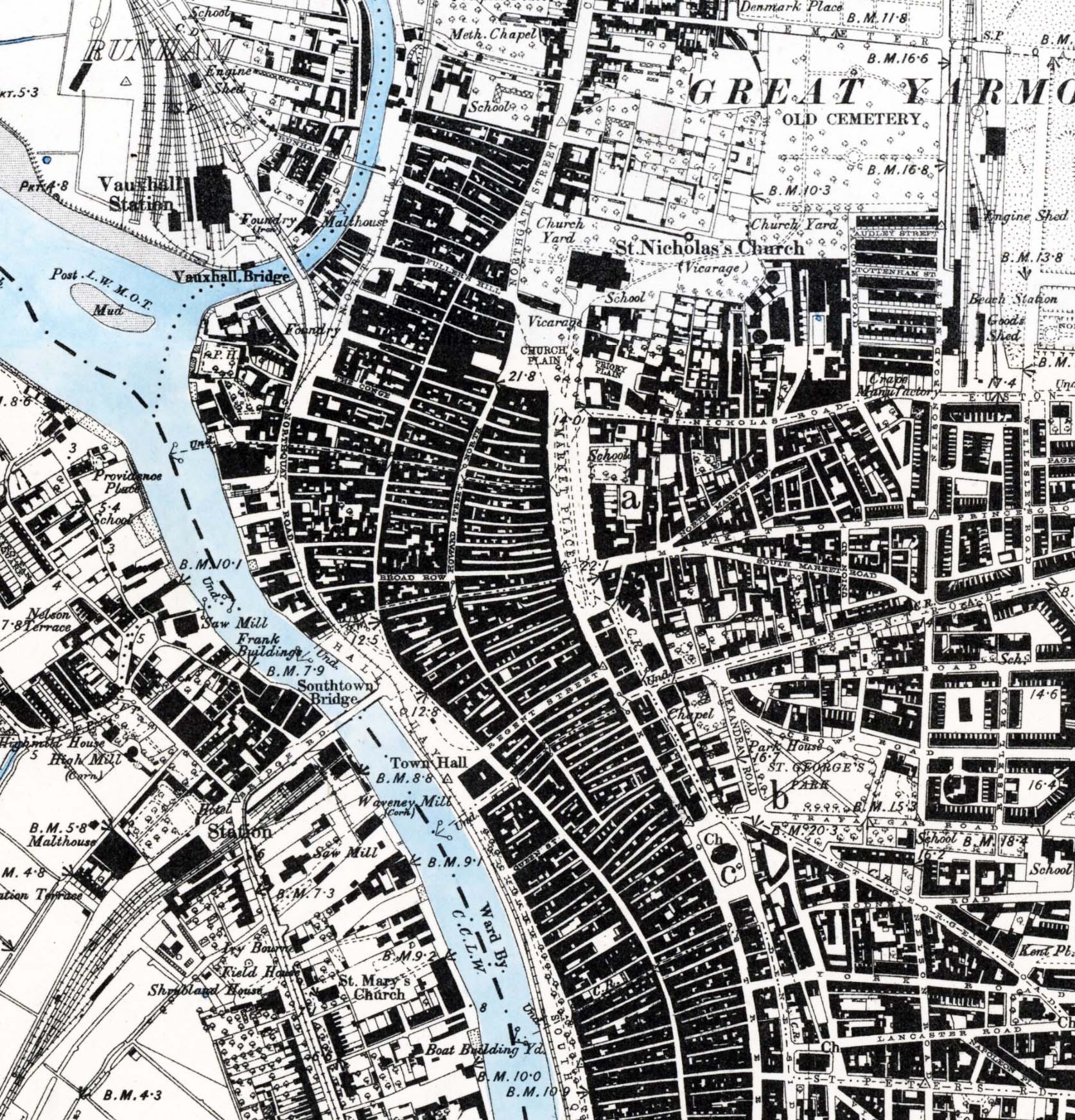 ![]() 1886 1:10, 560 OS Map. Although a little hard on the eyes, this map shows the positions of Yarmouth's three terminal stations relative to each other; Beach at top right; Vauxhall at top left; South Town at bottom left. Also visible is the quayside tramway with its connection to Vauxhall and part of the line connecting to the M&GN Beach station. When the link over Breydon Viaduct was in use it was possible to reach the quayside tramway from all three terminal stations, albeit with reversals and limitations on motive power permitted on the tramway. On Bridge Road and Southtown Road the street tramway from Gorleston is marked as a single track with a passing loop near South Town station. It was still a horse tramway at this time. The railway track leading to South Town goods yard is shown as being single. This is believed correct for this date. Shown running into the passenger station are two running lines plus one siding which appears to end at the trainshed without entering it. Either way, the two running lines concur with the original Arrivals and Departures platforms layout. Just west of the station the Malthouse (referred to in the text as The Maltings) is yet to have a rail connection. To the northwest of the station stands High Mill, said to have been the tallest brick-built mill in the country