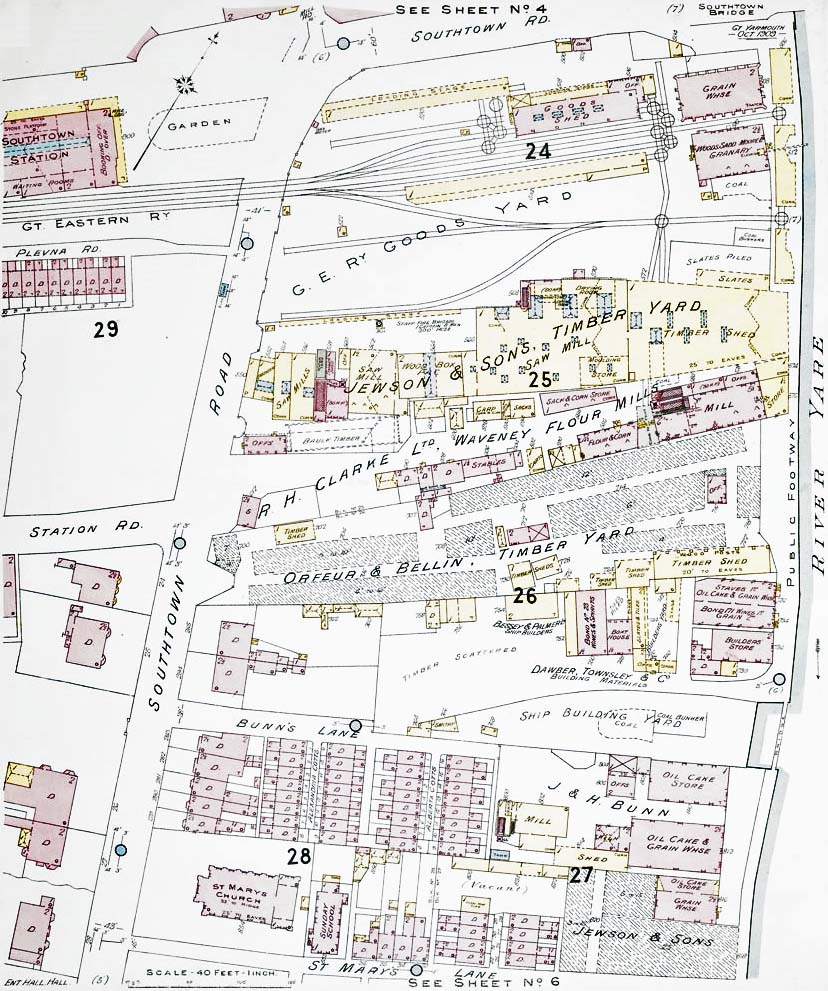 ![]() One of a series of 40ft to 1in plans produced by Charles E Goad in October 1909 for fire insurance purposes, in this case showing the area around South Town goods yard. Goad was a Canadian company which started out in 1875, opening a London office ten years later. Although not vastly different from any other map of the time certain labels, such as 'Slates Piled', 'Timber Scattered' and 'Vacant' represent the 'on the ground' situation at the time the survey was carried out and this is what differentiated insurance plans from standard maps. At top right, Haven Bridge is marked as 'Southtown Bridge' while notable by its absence is the electric tramway along Southtown Road. At top left, the station is spelled as one word and not as 'South Town' in the manner the railways always did. Clearly shown are the two tracks which passed along the south side of the station forecourt before crossing the road to enter the goods yard and, as mentioned in the text, these were the final lengths of track to remain in situ following closure. The awkwardness of the goods yard, being reliant upon numerous wagon turntables, is obvious. The yard saw several changes over the years and from surviving GER Records it appears the sidings disappearing into Jewson's timber shed began life as a single siding, whilst the aforementioned siding serving Jewson's loading stage was a later addition. Adjacent to the loading stage is marked 'Staff Fire Brigade', presumably a Jewson facility. South of the goods yard are numerous other industrial premises including a Ship Building Yard and another Jewson premises. These will have also used the GER goods yard but with cartage being used the short distance to and from but a good proportion of goods would have still been transported by water in 1909. Perhaps surprisingly, facilities for fish traffic appear to be absent, including the ice house (which was located adjacent to Haven Bridge). The reason for this was Yarmouth's fish traffic being mainly handled on the quays on the opposite side of the river which were served by the quayside tramway. There was, however, a smoking shed at some time and this did send out goods via South Town. At top left can be seen part of the passenger station. It shows the basic layout of the station building but is by no means well detailed. This is the only known surviving plan of the pre-1952 station building. British Railways’ plans from 1952 have, however, survived. Plan reproduced by kind permission of The British Library ![]()