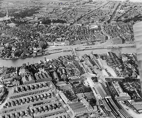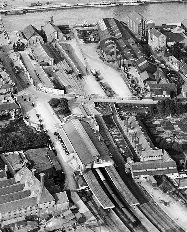 ![]() The first aerial view was included to show the location of the station and goods yard relative to Haven Bridge and the seafront. This is a closer version of the same view and shows certain details more clearly. The level crossing over Southtown Road and its gates can be seen, as can some of the wagon turntables within the goods yard. The electric tramway can also be better seen. On the opposite side of the river some wagons can be seen on the quayside tramway. At far left, the building on the corner with arched windows is the Railway Hotel; it still stands as of 2017 but is now a pizza outlet. The building below it is The Two Bears hotel which had a pair of bear statues on the apex of its frontage and installed in 1910. The statues can just be made out and survived demolition of the building in 2014/15. They now sit incongruously on the Hughes store which now occupies the site. In front of The Two Bears and running alongside the station is the cab rank, today Pasteur Road runs through the site. The pitched roof building at the end of the then-much-shorter Platform 4 was a left luggage store. Despite there being a left luggage office in the station building, when Platform 4 was extended in 1952 the store was for some inexplicable reason moved to the north of the track and thus was isolated from the station. Presumably the store was manned but this particular detail remains unclear. To the right of the maltings, bottom left, is the siding which terminated at a small dock. At bottom right is the goods dock with its hand-operated crane. Records show South Town possessed only one crane, of 6-ton capacity (Beach and Vauxhall had only 5-ton cranes), so this must be it. The goods yard, across the road, began life rather smaller and was expanded and altered over a long period of time but strangely there is no record of it ever having a crane. It will be noted that at this time there were no cattle pens on the goods platform to the right. The story of Great Yarmouth cattle market is something of a saga. It was located on Station Road, just out of view to the right, but at two different sites at various times; the first was on the north side and opposite the station and the second was at the far end occupying the land bounded by what is now an extended Station Road and Tamworth Lane, opposite the site of the locomotive turntable. Sometime in the early twentieth century another, smaller, cattle market had appeared squashed into the space between the station and the maltings. It occupied land believed to have been a bowling green and visible here on the east side of the maltings. The small dock adjacent to the maltings appeared in 1892, but there is no evidence that this dock was later used for cattle and its main user appears to have been the maltings. In any event this dock appears to have been too narrow to accommodate cattle. The cattle market near the maltings and that at Station Road/Tamworth Lane coexisted for a time. In 2017 all that remained was part of the Station Road site, a semi-derelict part cobble, part tarmac area. The site had been bisected by the extension to Station Road which turned southwards at this point. Click here for a larger version.