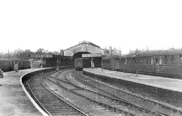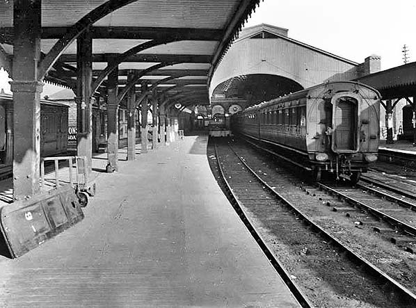 Photo from Andy Barton collection ![]() South Town station sometime during the 1930s. Visible is the original train shed, eventually removed in 1952. The shed, as built, extended back to the station building and thus also covered the concourse. During 1952 it was removed entirely and the concourse given a new roof to a rather austere design which would not have looked out of place on a factory or warehouse. By 1950 the platform awnings, as seen here, had been removed with only two stanchions remaining to support the trainshed roof. The awnings were not replaced until 1952 when they covered substantially more platform length. Why the awnings seen here were removed is not known but the fact they had gone by 1950 suggests either wartime damage or the need for major repairs for which resources were not available during the war. In the centre can be seen the release road which only ever served the arrivals platform. Most of the rolling stock visible is of Gresley origin and the uncoupled vehicles in the Up bay, right, suggest this bay was as usual being used for stock stabling. More stock is stabled in the siding at far left, the furthest vehicle of which appears to be a van of some description. The gap between the buildings beyond and to the right of the train shed was where the tracks leading to the goods yard passed through.