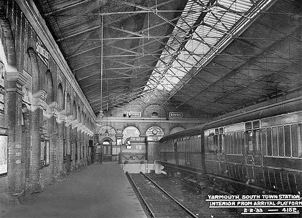 Photo from Andy Barton collection ![]() Part of a photographic survey of South Town station taken on 2 February 1933. This is one of the relatively rare views showing the trainshed and concourse with a reasonable degree of clarity. Some ex-GER rolling stock is stabled in the centre road which at this time does not appear to have been capable of use as a locomotive release road. The station now has four usable platforms and vehicles can be seen at Platform 1, far right, and Platform 4, far left. The building partly visible behind Platform 4 was a left luggage store. This was removed in 1952 and for some mysterious reason replaced by another building on the north side of the track and thus physically isolated from the station. Whether this replacement building was ever used as such is rather doubtful as there was a left luggage office in the station building, adjacent to the 1952 ticket and parcels offices.