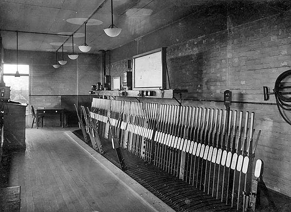 to Breydon Viaduct being required. Photo from Andy Barton collection ![]() The interior of South Town signal box on 15 May 1947. The box was just four years old at this time, the original having been damaged by the Luftwaffe. It is assumed, although unconfirmed, that the McKenzie & Holland 76-lever frame was recovered from the original box. Photographs of the interiors of ARP signal boxes when in use are relatively rare and this view shows well the rather forbidding and charmless working environment. Above the levers is the signalling diagram, block instruments etc. while on the left is the desk with train register, in which signalmen were required to record every train movement. The object on the wall, far right, appears to be a stirrup pump, perhaps left