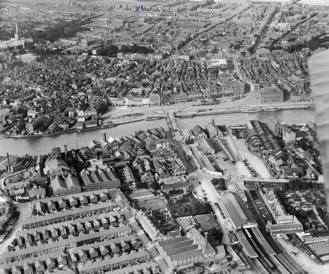 ![]() A June 1920 aerial view looking east across South Town station and goods yard. In the background can be seen Britannia Pier, one of two piers at Great Yarmouth, the other, Wellington Pier. The River Yare runs across the middle of the picture and Haven Bridge can be seen midway. West of the bridge runs Bridge Road which then turns left and becomes Southtown Road. On Bridge Road is a tram, seemingly departing for Gorleston. The tram terminus was directly in front of the bridge (see text). Although by no means clear, Haven Bridge at this time was still the narrow structure with wooden lifting section. On the opposite side of the river and to the right, the large building is Great Yarmouth Town Hall. At the bottom of the picture and right of centre is South Town station, its train shed hiding much of the station building from view. To the left of the station is the maltings and to its right the houses of Plevna Terrace, Station Road being further to the right. Between the station and the warehouse set at a right angle to Plevna Terrace ran the tracks leading to the level crossing and goods yard. The level crossing is just about discernible. Much more discernible is the station garden in the centre of the forecourt. In the north-east corner of the goods yard and near to Haven Bridge, the building which resembles a chapel is the ice house. The buildings west of and in line with the icehouse are the GER goods shed with a granary beyond and, on its north-west side, the loading bay. The building south of and adjacent to the icehouse is another granary. On the quayside and set parallel to the river were three other buildings, largely hidden from view in this picture. The open area in the middle of the site contained two sets of three sidings which fanned out east of the level crossing, one set being served by each of the two tracks which crossed the road and with both sets interconnected via wagon turntables within the goods yard. Roughly in the middle of the open area, what appears to be a train of vans is in fact another loading bay but precisely what was loaded or unloaded there is not recorded. The clutter of buildings at the south of the yard, i.e. on the right as we view, was the premises of Messrs Jewson. At the west end of Jewson's premises and butting-up to Southtown Road was a loading stage and the siding which served this can be discerned snaking its way across the open area. This siding could be reached only via a wagon turntable on a siding which ran north to south from the GER goods shed, via another such turntable, into Jewson's warehouses where it divided into two short stub-end sidings via the same turntable which gave access to Jewson's loading stage. Being shunted by horses originally, the goods yard would also have had stables at its disposal but the location of these has not been discovered. They may not necessarily have been in the goods yard but near the passenger station. South of Jewson's premises stand the Waveney Flour Mills of, then, Messrs Clarke. The GER provided a siding for Clarke but precisely where it was located has remained a mystery. In 2017 the icehouse still stands and is Grade II listed. Waveney Flour Mills are also still there and still operational, now producing Semolina.