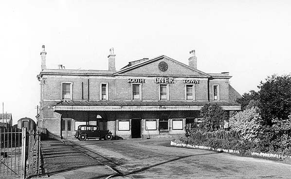 Photo from Roger Griffiths collection ![]() South Town station forecourt in September 1951 and still with its LNER branding which would survive until the following year. The unkempt garden would also survive only until the following year. At this time such unkemptness was somewhat unusual and may have been allowed to occur during the war years. Behind the gate, far left, out one of the tracks which continued across the road into the goods yard can just be made out. On this occasion both tracks appear to have been commandeered for rolling stock stabling. The car is highly suspected of being H C Casserley's well-known 1934 Hillman Minx and, visible under magnification, it still carries white wing and bumper tips - a hangover