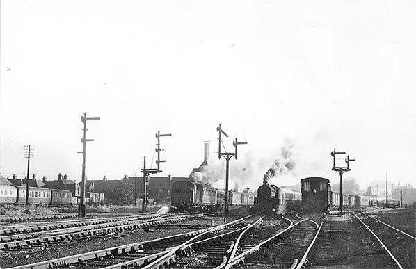 ![]() It is shocking to think that less than nineteen years after this photograph was taken, this scene would be one of utter dereliction. This is Yarmouth South Town one morning in September 1951, looking towards the terminus. The locomotive at Platform 3, left, is one or other of the 0-6-0 tanks, possibly a J68, and according to its lamp is on station pilot duty (visible in a larger version of this image) and this would explain the odd train formation; the third vehicle is a goods van and the fourth appears to be an ex-LMS 42ft CCT. Providing the goods van was fitted or through-piped there is no reason such a formation could not run within the speed limit for such vans but non-passenger-carrying stock would not be marshalled in the middle of a rake of corridor passenger stock when in service. The B1, right, which is thought to be No.61001 Eland, is carrying express passenger lamps and given that Platform 1 could accommodate eight bogies, the train is quite lengthy and thus is probably a service to Liverpool Street*. The signal which is 'off' controls Platform 2 and also locomotives which have joined Platform 2 road from the centre release road. What has emerged, or is about to emerge, from Platform 2 is not known. Various types of passenger and goods stock can be seen scattered around in the usual haphazard manner typical of South Town. At far left, the ex-LNER stock comprises two vehicles in BR 'blood and custard' livery while the other would be in painted teak livery. One, that partly visible far left, is a Gresley bow-ender and the Blood & Custard (properly 'Carmine & Cream') livery sat particularly well on these vehicles. In the right background the rarely photographed cattle pens can be seen. The coaching stock in the right background will be the same stock seen in the 1951 view of the station forecourt, the stock being stabled on the roads leading to the goods yard. [*A 1948 timetable shows a departure for Liverpool Street at 8.00 and may or may not be correct for 1951. There was another departure for Liverpool Street at 9.00 and this joined with a portion from Norwich at Ipswich. A working timetable (WTT) from 1954 shows departures for Liverpool Street had changed to 7.30 and 9.43, the latter being loaded to nine bogies and ran all stations to Ipswich].