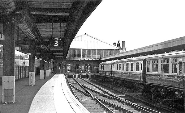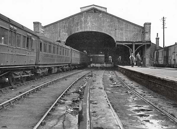 Photo from Andy Barton collection ![]() Peering into the gloom that was South Town's trainshed on 12 September 1950. Of interest here are the platform awnings, or their absence. They had been removed by this date with only stanchions supporting the end of the trainshed remaining. This applied to both [island] platforms as the end of the truncated awning on Platforms 3 and 4, left, is just visible above the second carriage. This scene was transformed in 1952 with the removal of the trainshed and installing of new platform awnings. The train at Platform 3 comprises ex-GER and ex-LNER Gresley stock, the introduction of BR Mk1 stock still being a year away. The train has been taken into the platform by a tank locomotive which may be the station pilot or had brought the train from Beccles or Lowestoft. Whatever it was, the locomotive has drawn up to the buffers so will need to await the train's departure so that it can be released. To see anything beneath the trainshed requires lightening of the image but, even when doing this, it is unclear if the points to the centre release road were in situ at this time. On the right and at the buffers of Platform 1 sits the old 6-wheel carriage which seems to have been present for some considerable time. At other times a goods van would be present and either type appear to have been used by station staff for one purpose or another.