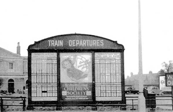 Copyright photo by HC Casserley ![]() The rather grand Benn & Cronin Train Indicator board which stood outside South Town station facing onto Southtown Road. It is seen here in 1952 when the station was undergoing alterations. Unfortunately little on the board can be read but from what can be seen weekday times are towards the top and Sunday times towards the bottom. Benn & Cronin were well known for postcards, artwork and advertising. They were also responsible for many of those delightful pictures once found in railway carriage compartments, long before the days when the interior of trains went plastic, clinical and resembling of hospital corridors. The structure seen here was typical Benn & Cronin and was of a general style installed at many stations in the 1920s. They invariably included advertising space, as here, and were tailored dimensionally to suit the intended location. This was a horizontal type, others were more square whilst yet others were vertical but, as said, they followed a general style which was instantly recognisable. The board was removed soon after being photographed. A Benn & Cronin Indicator is known to have been installed inside the booking hall subsequently but it is not known if it was this board relocated or a replacement item. As many photographs show, train information was also displayed on poster boards affixed to the front of the station building but it appears that none are yet present when this view was captured. Insofar as timetable information was concerned, lack of information was something of which British Rail was rarely accused. The Children's Society is a charity still with us today.