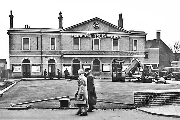 Photo from Jim Lake collection ![]() Two ladies in period clothing and with typical period shopping accoutrements amble past South Town station during the 1952 propulsion into the modern age. The garden has vanished and the forecourt is being given a nice new tarmac surface. It would appear that the boundary wall, right, is also new or at least its brickwork has been repointed and new coping stones added. The camera is looking at what had been the original ‘Way In’, now widened somewhat. The ’Way Out’ is out of view to the right, as is the impressive departures board which was to remain in situ a little while longer. On the right, and with the maltings as a backdrop, is the then new refreshments room, at this stage yet to receive its signage or indeed the metal brackets which supported it. The tracks which crossed Southtown Road to reach the goods yard are out of view to the left. On the forecourt is an Aveling - Barford diesel roller and probably, from what can be seen of it, an AD155. These were a progression of the earlier Aveling - Perkins rollers using a single cylinder Ruston engine and at one time were a familiar sight. Many were owned by local authorities and often painted in drab shades of grey. To its right is a Bedford tipper lorry; possibly an O series it could be one of several similar-looking models. To the right of the Bedford is a limousine of some description. At the time the work on the forecourt was in progress; other parts of the station were also receiving a makeover. All of this work and expense for a station which, as it transpired, was to see only another decade of regular main line trains.