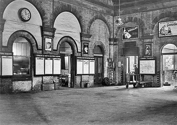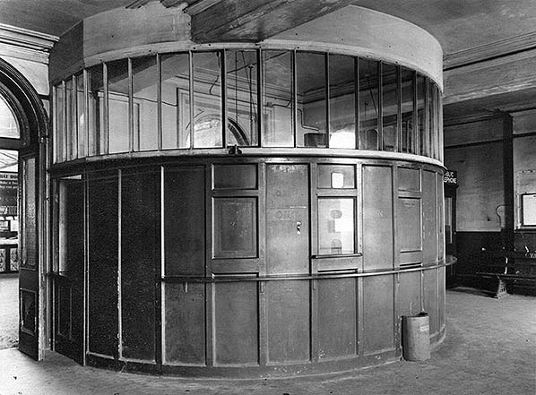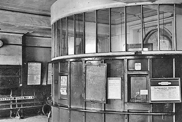 ![]() Yarmouth South Town ticket office seen here on 3 October 1950. The office was located in the booking hall (there is a difference between a booking hall and a ticket office) which was the front section of the station building, above which was stationmaster's accommodation. Through the doorway on the left part of the W H Smith bookstall can be seen, a rectangular structure which sits in the middle of the concourse, beyond which were the platforms. Behind the solid section of wall at the back of the ticket office stood a small tobacco kiosk. According to British Railways plans of the 1952 alterations this tobacco kiosk remained in situ as did the W H Smith bookstall. The new ticket office was to be located behind the camera and to the left of passengers as they entered the building from the forecourt. When the ticket office seen here was removed, the arched window behind the office was bricked up and a Benn & Cronin Train Indicator board was mounted this side of the wall but it is not known if it was a new item or a relocation of that which had stood outside overlooking Southtown Road (see picture). Although the general fabric of the ticket office is typical of the nineteenth century, it is not known if this rotund example dated from the station's opening. The upper glazed part and its continuation to the ceiling certainly appear to have been an afterthought. The stable door on the left is the staff entrance and the office has provision for several teller positions although, at this time at least, only one was in use and this becomes obvious from the interior view. Just visible on the woodwork are 'In' and 'Out' signs to the right and left respectively of the teller position, the passenger flow thus corresponding with the station's original Arrival and Departure platform layout. The litter bin was not very well positioned if intending passengers were supposed to queue from the right and especially on a warm day when the bin would likely become rather odorous - a problem with the once common 'open' type little bins which readers above a certain age will remember. To the left of the teller position is a bell push, used to attract the clerk's attention when, during quiet periods, he may be at his desk catching up on paperwork. In 1950 South Town was still a busy station, especially during summer weekends, and just one teller position might therefore appear woefully inadequate. In practice many visitors to Yarmouth would arrive with return or excursion tickets so the situation with the ticket office would not have posed any problems. On the right, and lurking in the gloom in front of the telephone booth, is a bench seat complete with nameplate. It is a standard GER item and not one of the ornate items nodding to the fishing industry.