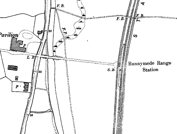 Initially Colnbrook was the only intermediate station but, after closure of the ranges on Wimbledon Common, a Metropolitan Rifle Range Company was formed in 1890 to build new ranges near London for those Volunteers who were reluctant to travel to Bisley. One of the directors of the new rifle range company was also a director of the S & WDR, so perhaps it was no surprise that the chosen site for the new range was at Staines Moor, just west of the new line. The GWR agreed to provide a halt called Runemede, which opened with the ranges on 1 March 1892.