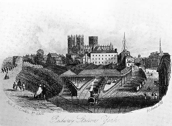 Notes: The first permanent station at York was opened by the York & North Midland Railway Railway (YNM) on 4 January 1841. Located within the York city walls the station replaced a temporary facility that was located outside the walls and which had been opened by the YNM on 30 May 1839 when their line between York and York Junction (on the Leeds & Selby Railway) opened. By 1 July 1840 the YNM line had been extended to link to the North Midland Railway (NMR) at Normanton. The NMR linked Derby and Leeds and at Derby it had an end-on connection with the Birmingham & Derby Junction Railway which in turn connected with the London & Birmingham Railway. Through all of these routes York was connected to London via Derby and Birmingham. York station was shared with the Great North of England Railway (GNER) which linked York to Newcastle and opened to goods on 1 January 1841 and to passengers on 1 March 1841.