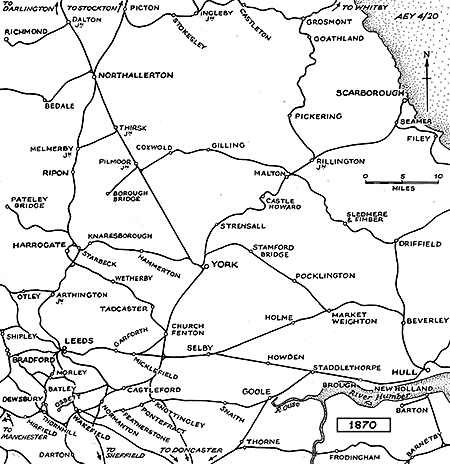 On 8 July 1845 the YNM opened a line between York and Pickering which made an end-on connection with the Whitby & Pickering Railway (opened throughout on 26 May 1836 and purchased by the YNM on 30 June 1845). In 1847 links were made to Harrogate and Market Weighton and in 1848 to Hull.