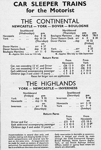 The ‘Highlands Car Sleeper’ was a summer service and in 1956 it operated between 17 June and 9 September. The service did not appear in the timetable until 1957. In that year departure from York was at 9.55pm on Fridays only. Arrival from Inverness was at 7.09am on Sundays only. A further service appeared in the timetable in 1957: ‘the Continental’. It ran between Newcastle and Boulogne (France) and called at York. Departure from York for Dover and Boulogne was at 10.24pm on Wednesdays and arrival from Boulogne and Dover was at 6.25am on Fridays (when first introduced in 1956 ‘The Continental’ had called at Stockton rather than York). These services became very popular and additional trains were run. In summer of 1962 an additional ‘The Continental’ went south on Mondays and north on Tuesdays from 24 July to 28 August. The return working was on Tuesdays. Three ‘The Highlands’ services were operating in 1962 two going north on Fridays and Sundays throughout the summer period and one running on Wednesdays between 26 July and 16 August.