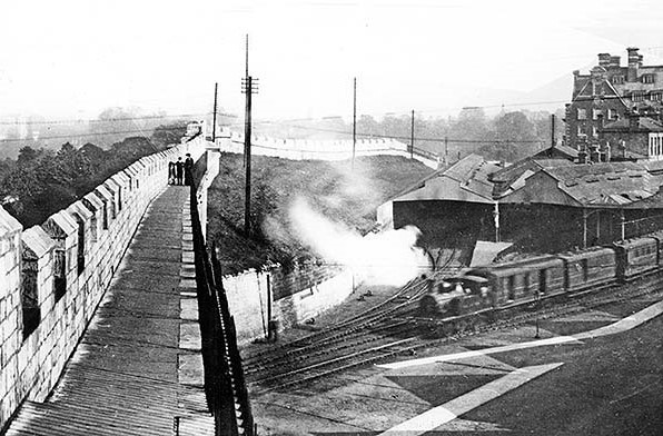 The platforms at the passenger station and the trainshed were extended and a third platform was created on the eastern side of the departure platform. In September 1846 a further two platforms were created to the west of the original station. The supporting bank of the city wall had to be cut back and a retaining wall constructed. The new platforms became known as the Scarborough Bays as they were used by services to that destination. Like the original station these platforms were provided with a trainshed roof.