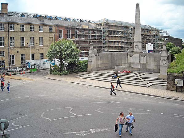 Photo by Brian Johnson ![]() The western end of the main station building seen on 2 July 2011. At ground level are windows and doors that would have faced onto the departure platform. A trainshed roof had originally protected that part of the building from the weather. The scars of the 1956 additional office space that had straddled the tracks can be seen at first floor level. The area of lighter coloured wall to the right at first floor level was the office of Brian Johnson, a Freight manager in BR, then as NE Zone Track Access Manager in Railtrack between 1985 and 1995. The second floor is the NER office extension of 1860. In this view work was underway on the creation of an office complex for York City Council. Photo by Brian Johnson ![]() A view looking south-east on 2 July 2011 from the York city wall. In the foreground the frontage of the original dinning rooms that had opened in 1841 can be seen. The dinning rooms had faced onto the arrival platform. The platforms had original been protected by a trainshed roof. Photo by Brian Johnson Looking south at the NER War Memorial and the York station hotel on 10 June 2012. The war memorial had been unveiled on 14 June 1924 and it occupied what had been the eastern end of the 'Scarborough Bay' platforms. The trainshed roof of the bay platforms had been removed so that the war memorial could be sited at this location. Photo by Alan Young ![]()